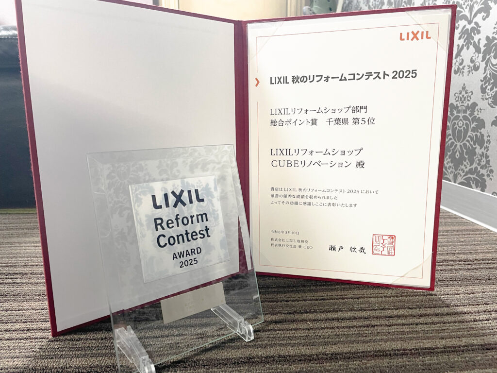 NEWSお知らせ 2026年3月17日 【受賞】LIXIL秋のリフォームコンテスト2025 千葉本社 お知らせ LIXIL秋のリフォームコンテスト2025LIXILリフォームショップ部門総合ポイント賞 千葉県第5位をいただきました! 日頃からご依頼いただくお客様のおかげでいただけた賞です。いつも私たちを信頼して任せてくださる皆さまに、心より感謝申し上げます。 これからもひとつひとつの現場を大切に、頼んでよかったと思っていただける暮らしをお届けできるよう、スタッフ一同努めてまいります。