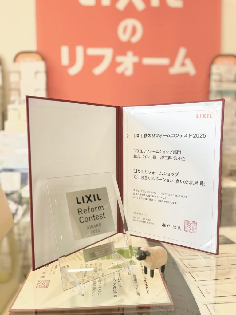 NEWSお知らせ 2026年4月6日 【受賞】LIXILリフォームショップ秋のリフォームコンテスト2025 さいたま店 お知らせ LIXIL秋のリフォームコンテスト2025 総合ポイント賞 埼玉県第4位 をいただきました! 日頃からご依頼いただくお客様のおかげでいただけた賞です。いつも私たちを信頼して任せてくださる皆さまに、心より感謝申し上げます。 これからもひとつひとつの現場を大切に、頼んでよかったと思っていただける暮らしをお届けできるよう、スタッフ一同努めてまいります。