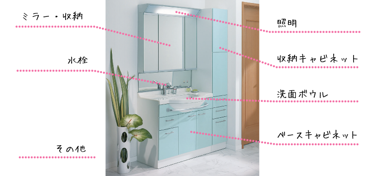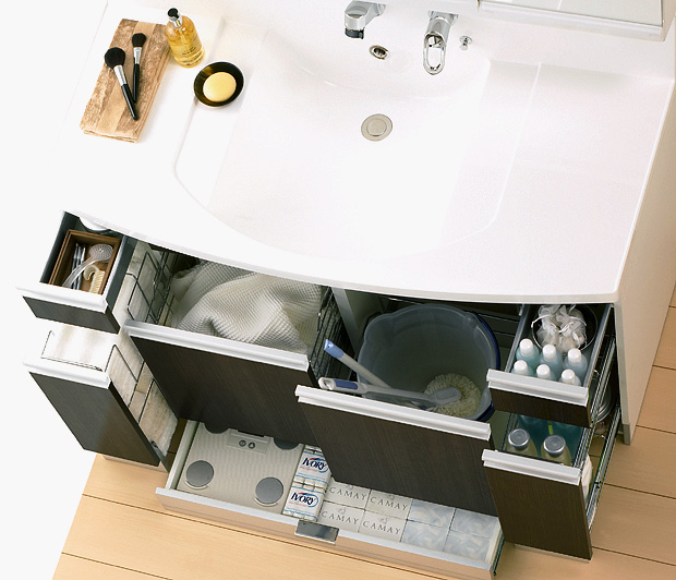 洗面台は、スタンダードな扉タイプと、収納物が取り出しやすい引き出しタイプから選ぶことができます。