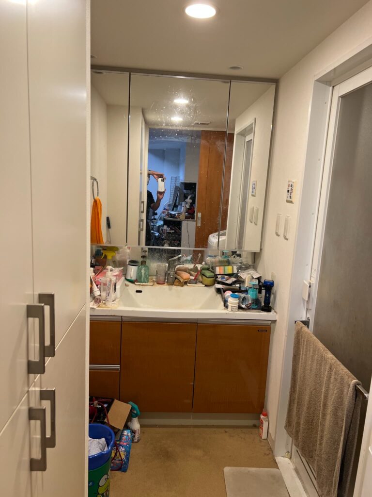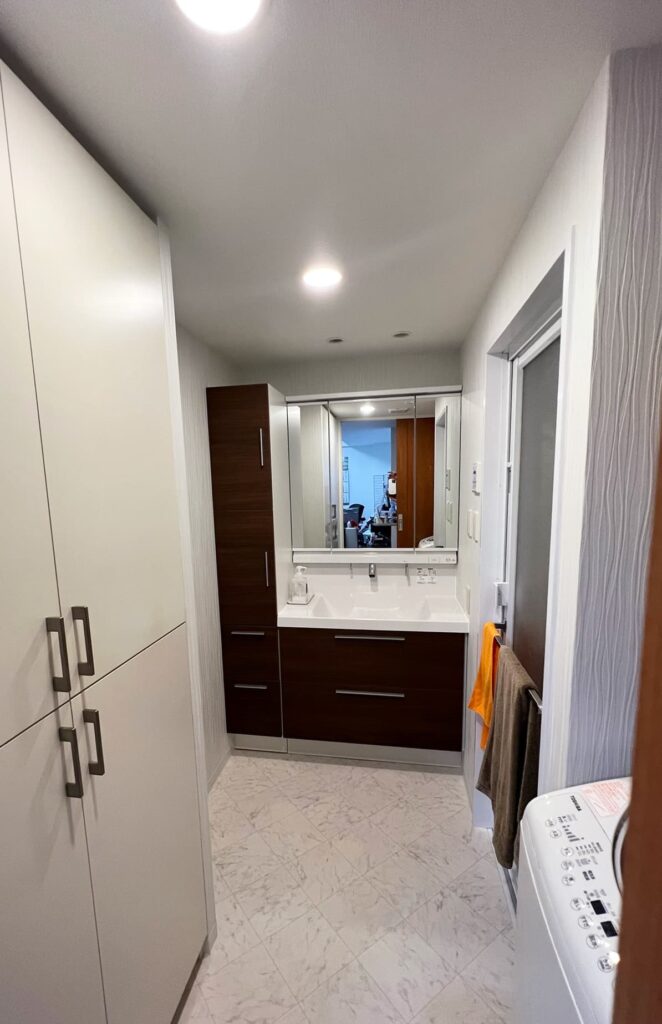 収納の増加をご希望のため、LCの900㎜+300㎜トール収納を左付けでお勧めしました。右側に浴室入り口があるため、使い勝手を優先しました。