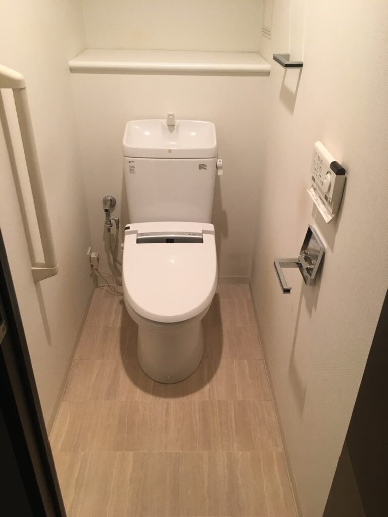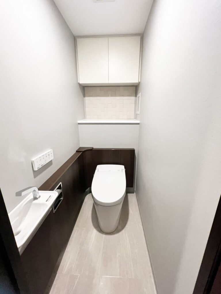 全体のクロスをグレーにし、奥の壁にはエコカラットのペトラスクエアを貼りました。ホテルのトイレの様に綺麗に仕上がりましたね。