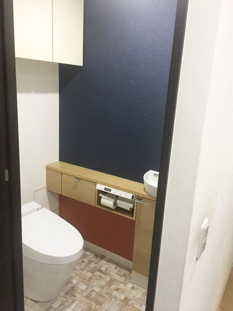 床材はフローリングから石目調のフロアタイルに変え、クロスも腰高で紺色と赤茶系のツートンカラーしました。手洗いのボウルはベッセルタイプで明るい木目の扉とカウンターで、壁紙とのコントラストで綺麗にまとめました。トイレのリモコンもカウンターにスッキリ納まるインテリアリモコンを採用、トイレと床が白基調なので空間は明るくカウンター側の壁がとても映えるいい感じです。