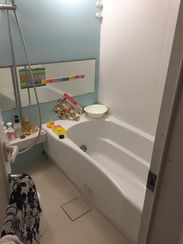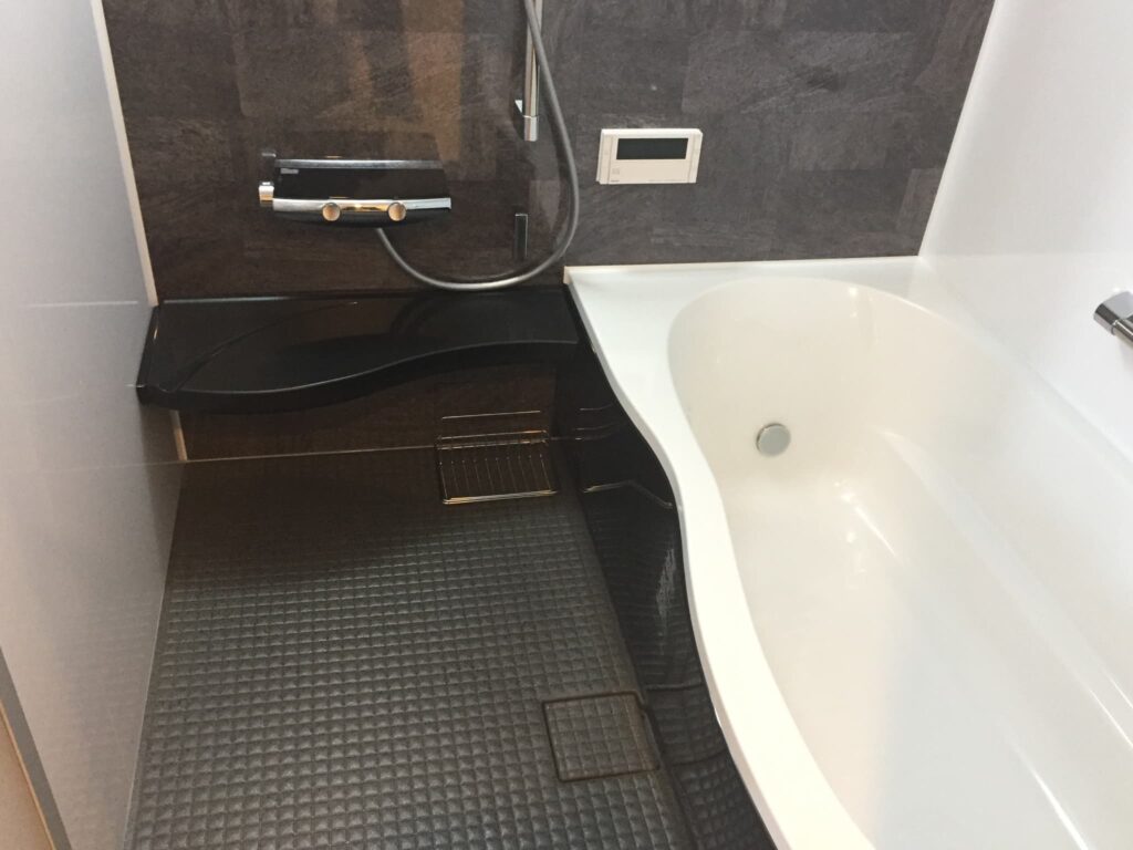 お風呂はリノビオVシリーズ1717サイズでアクセントパネルを組石グレー、床もグレー、カウンターと浴槽エプロンをブラックにして落ち着いた雰囲気のお風呂にしました。