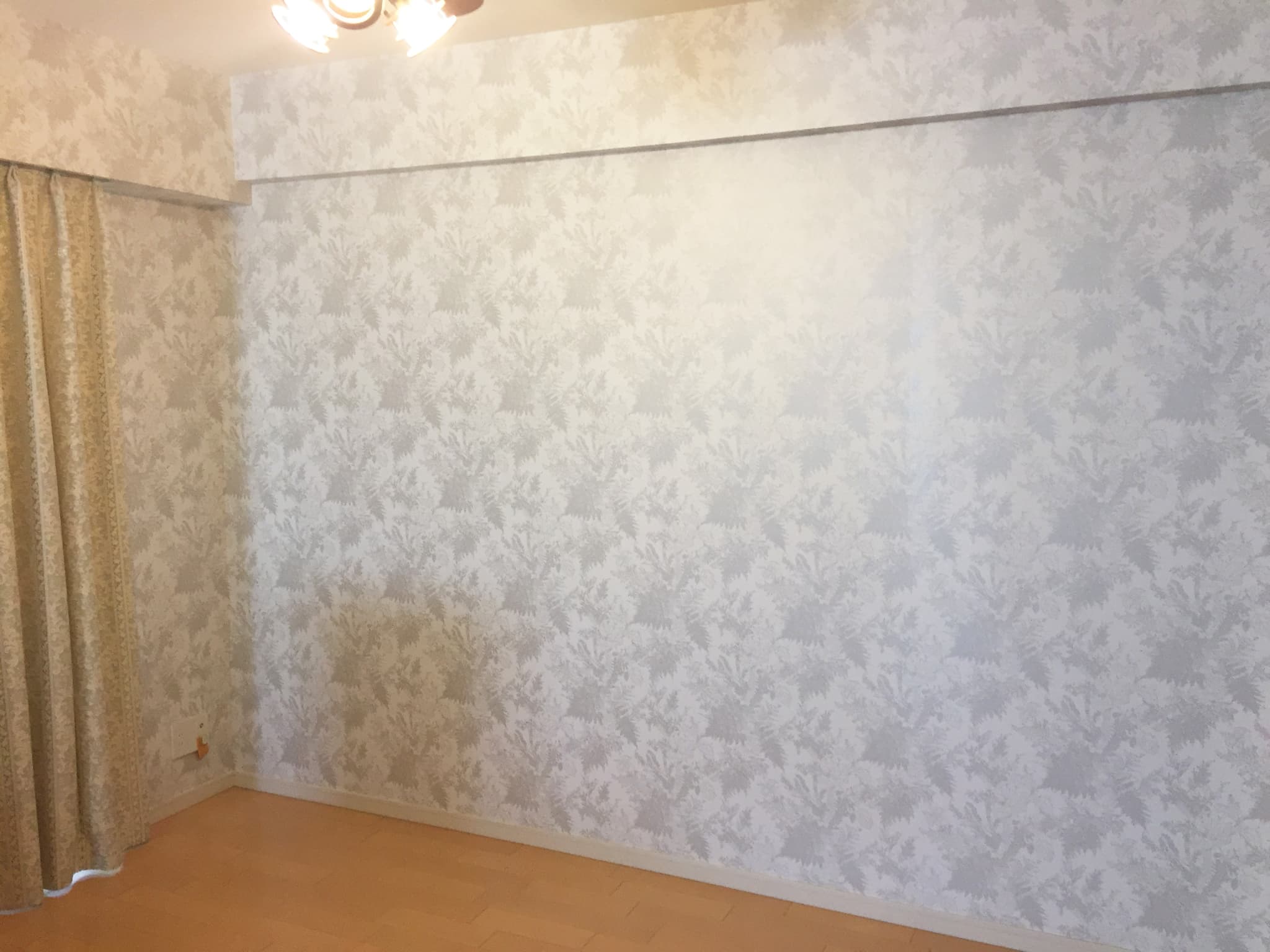 普段は案内されないようなデザインのクロスが目白押しです。リビングにも白基調の洋物クロスを壁に施しました。