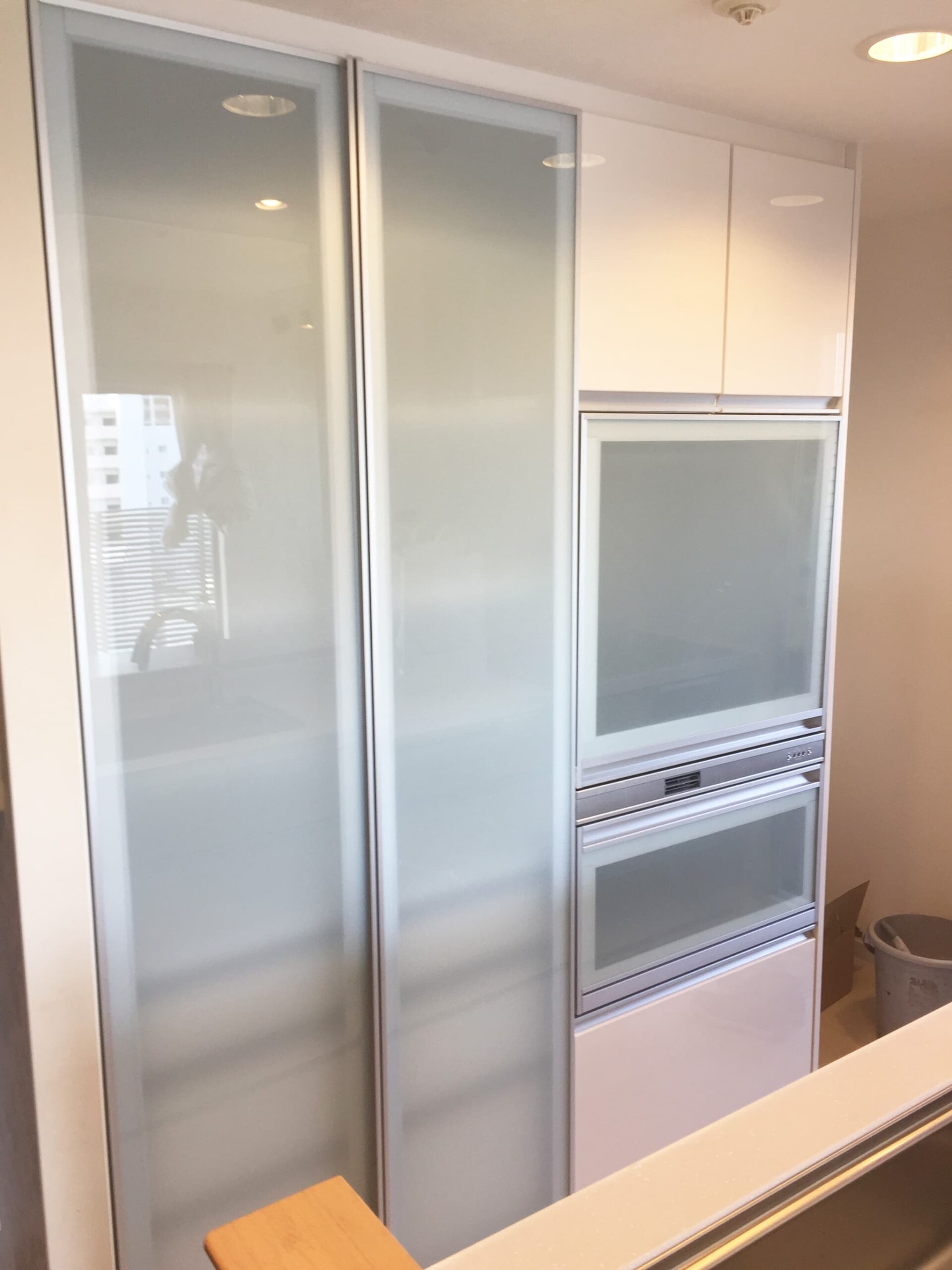 キッチンの背面収納はアクリルトール仕様のカップボード、豪華な家電タワーを組み合わせました。家電タワーには電子レンジもスッポリ入り炊飯器などすべてが隠れてスッキリします!!