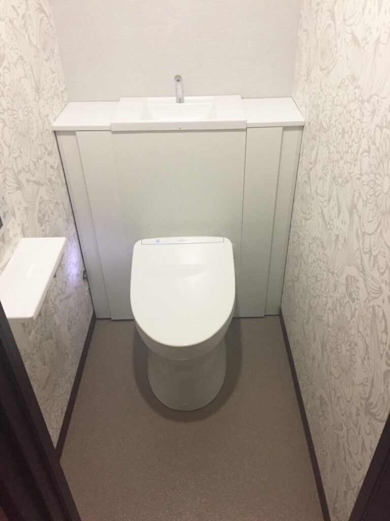 トイレの施工前、施工後です。両サイドに白基調の洋物柄クロスを使用しました。ホワイトベースなのでとても清潔感と明るさが際立っています。