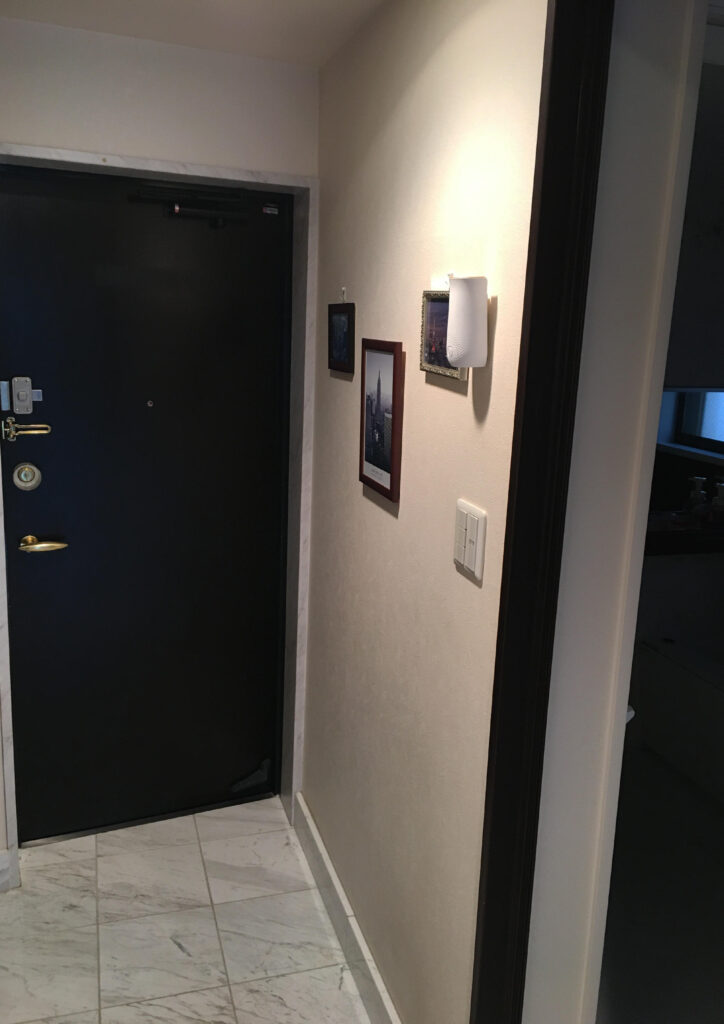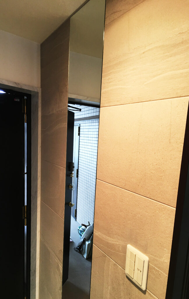 家具の配置を変えるので、壁一面にエコカラットを貼りたいという事と、玄関に姿見が無いのでミラーを貼りたいとの事でした。