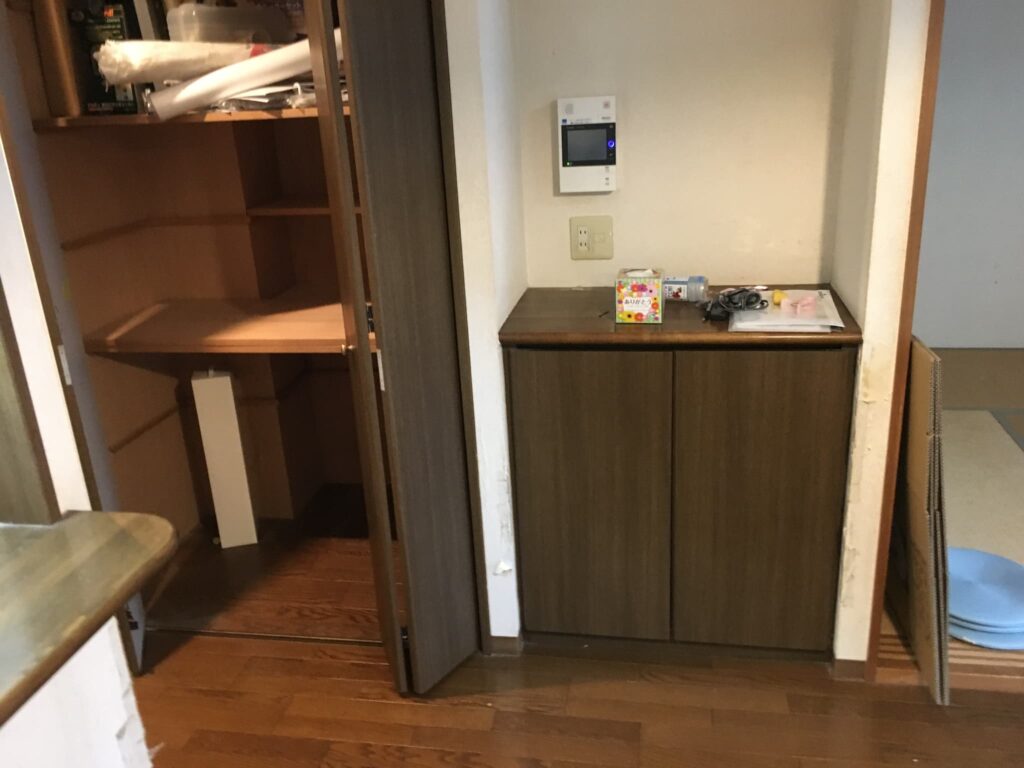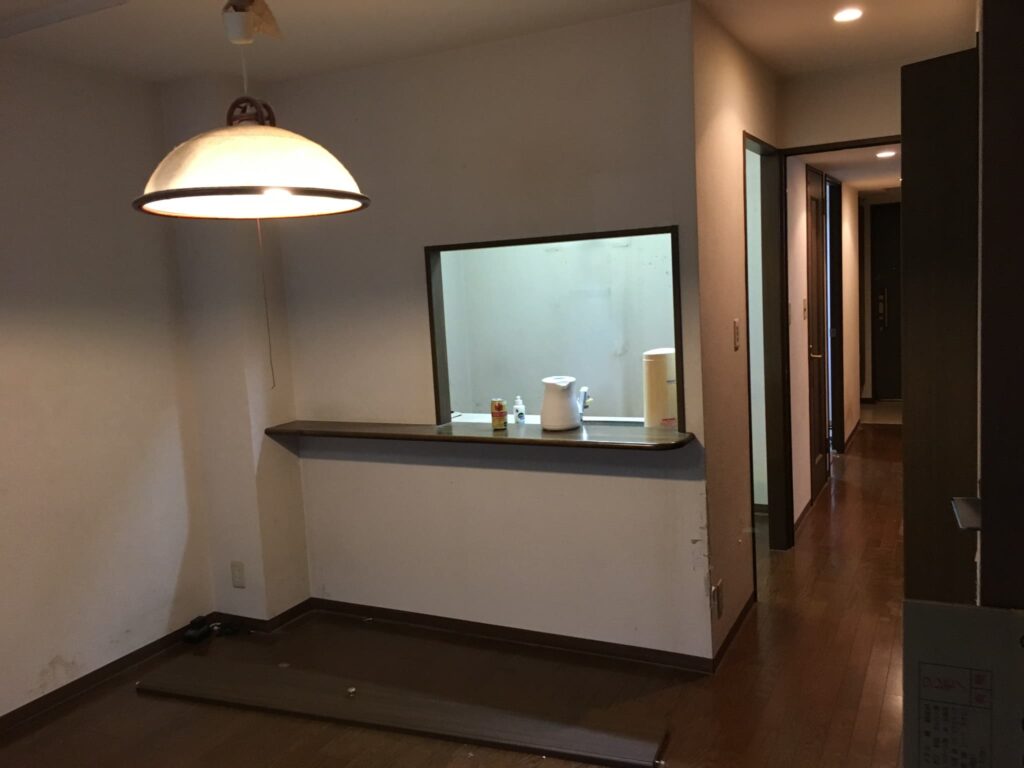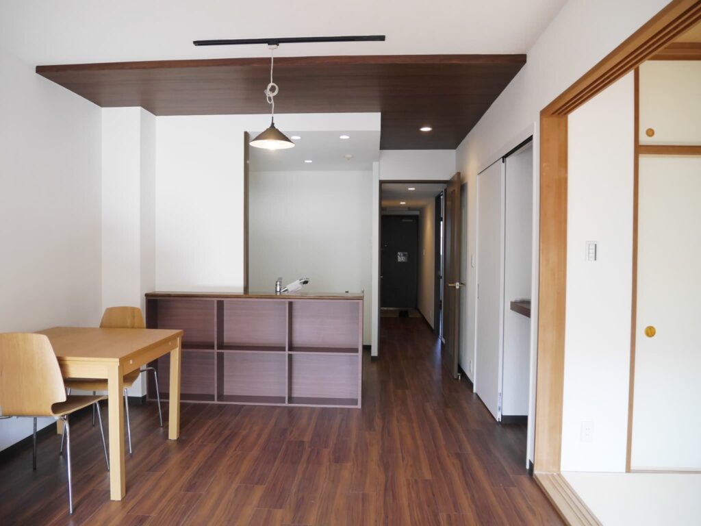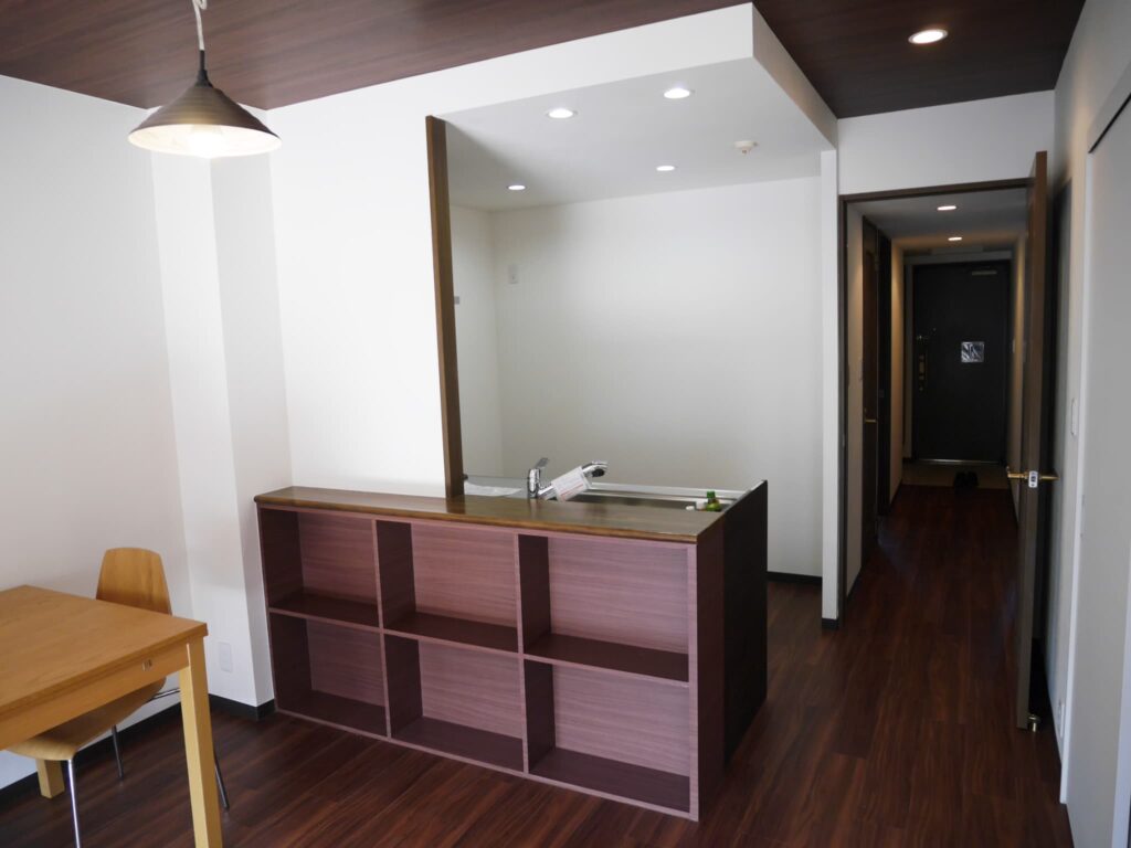 リビング廊下は既存のL45のフローリングの上から9mmのベニアを張りその上からフロアータイルのフローリング調を貼りました。そうすることで既存のフローリングを剥がす手間と新たなフローリング材も掛からずさらにフカフカ感のフローリングではなく硬いフローリング感の仕上がりになります。マンションの規約のl45の上からなので規約も満たし費用も抑え仕上がりも綺麗です。