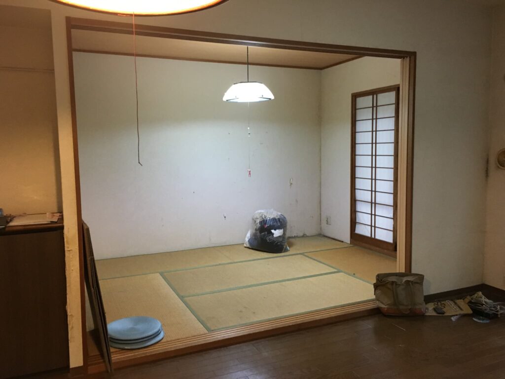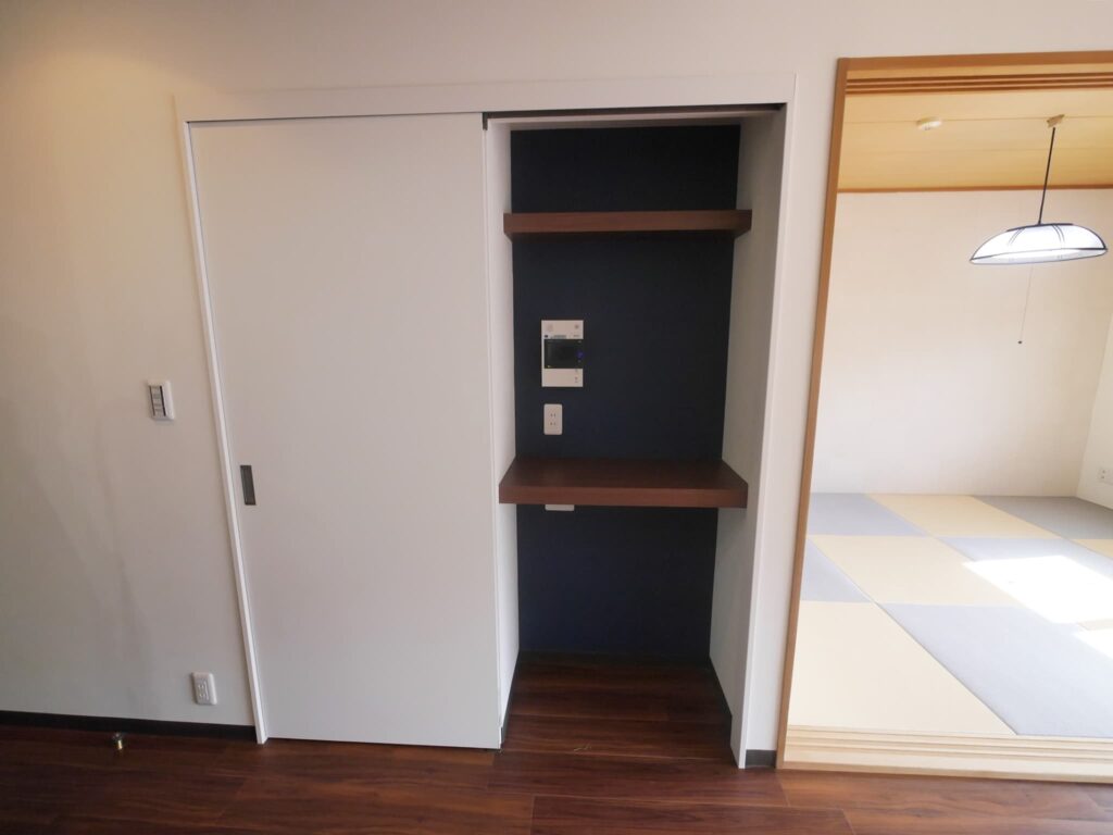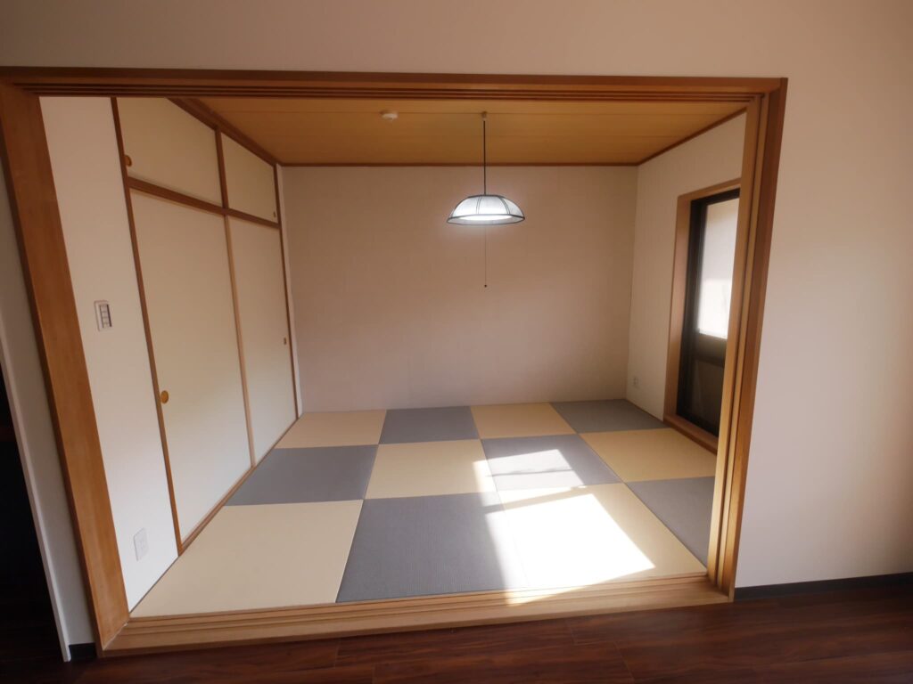 和室は琉球畳を貼り襖などにはクロス貼り替えだけにしました。和室の奥の壁はエコカラットのたけひごが市松模様に貼ってあります。