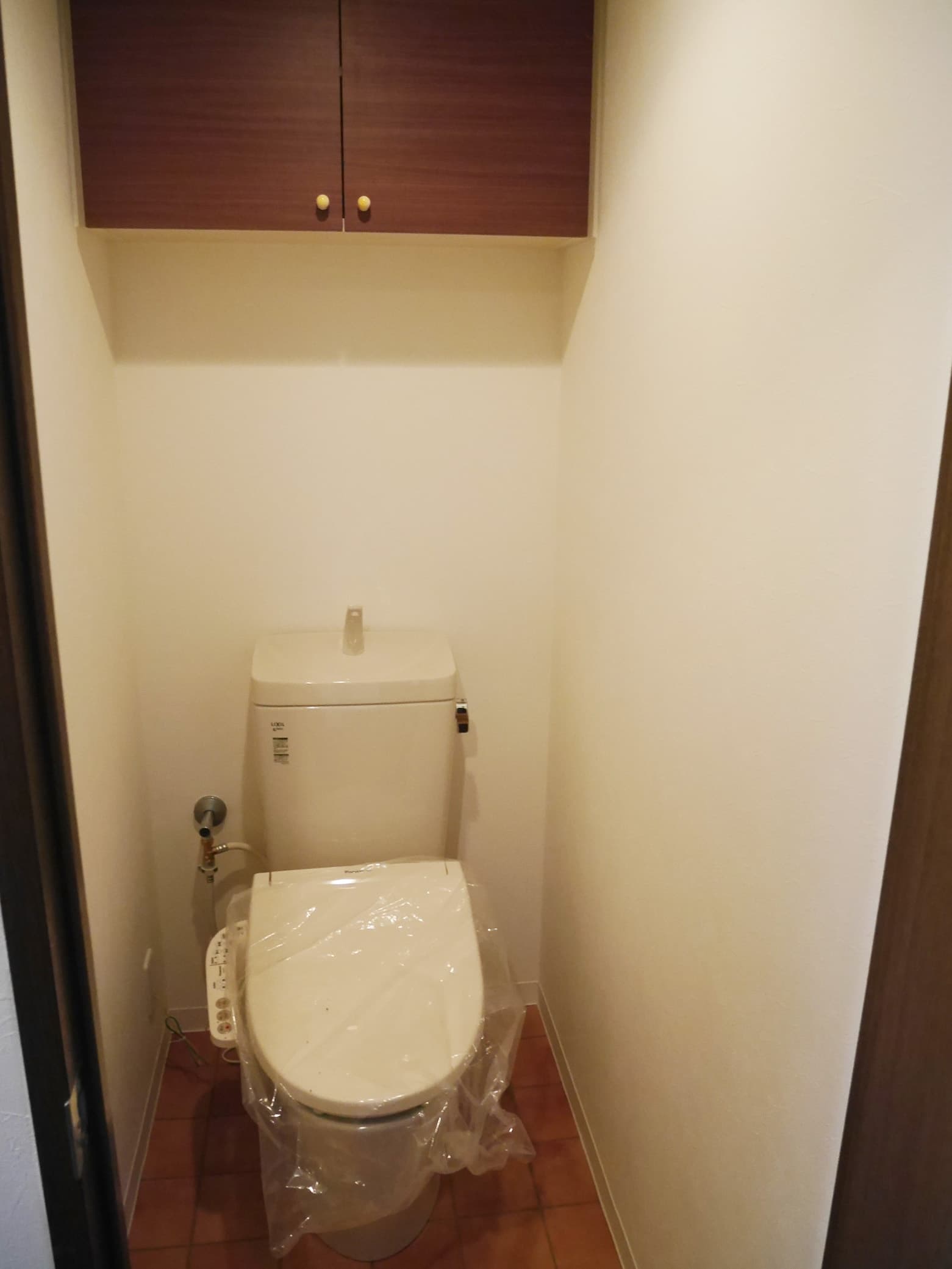 トイレもLIXILアメージュ マンション用に交換です。壁面にLIXILのエコカラットをデザインと消臭効果の意味で貼りました。吊り戸棚は3Mのダイノックシート貼りリメイクです。扉などが壊れていなければリメイクで十分だと思います。
