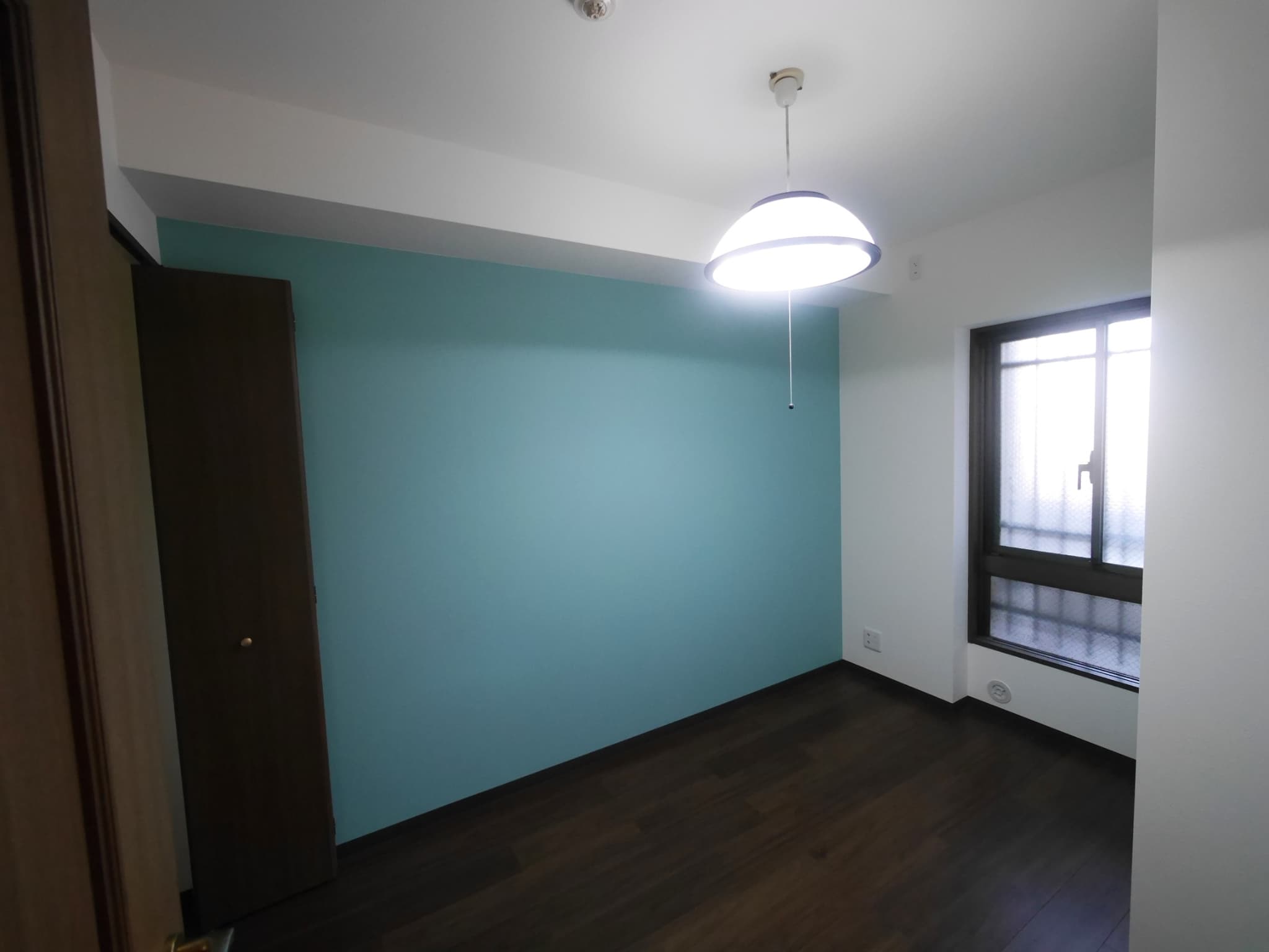 カーペットからL45フローリングへ。アクセントクロスはブルーグリーン、黒板使用でチョークで書いたり出来ます。子供部屋用ですね。