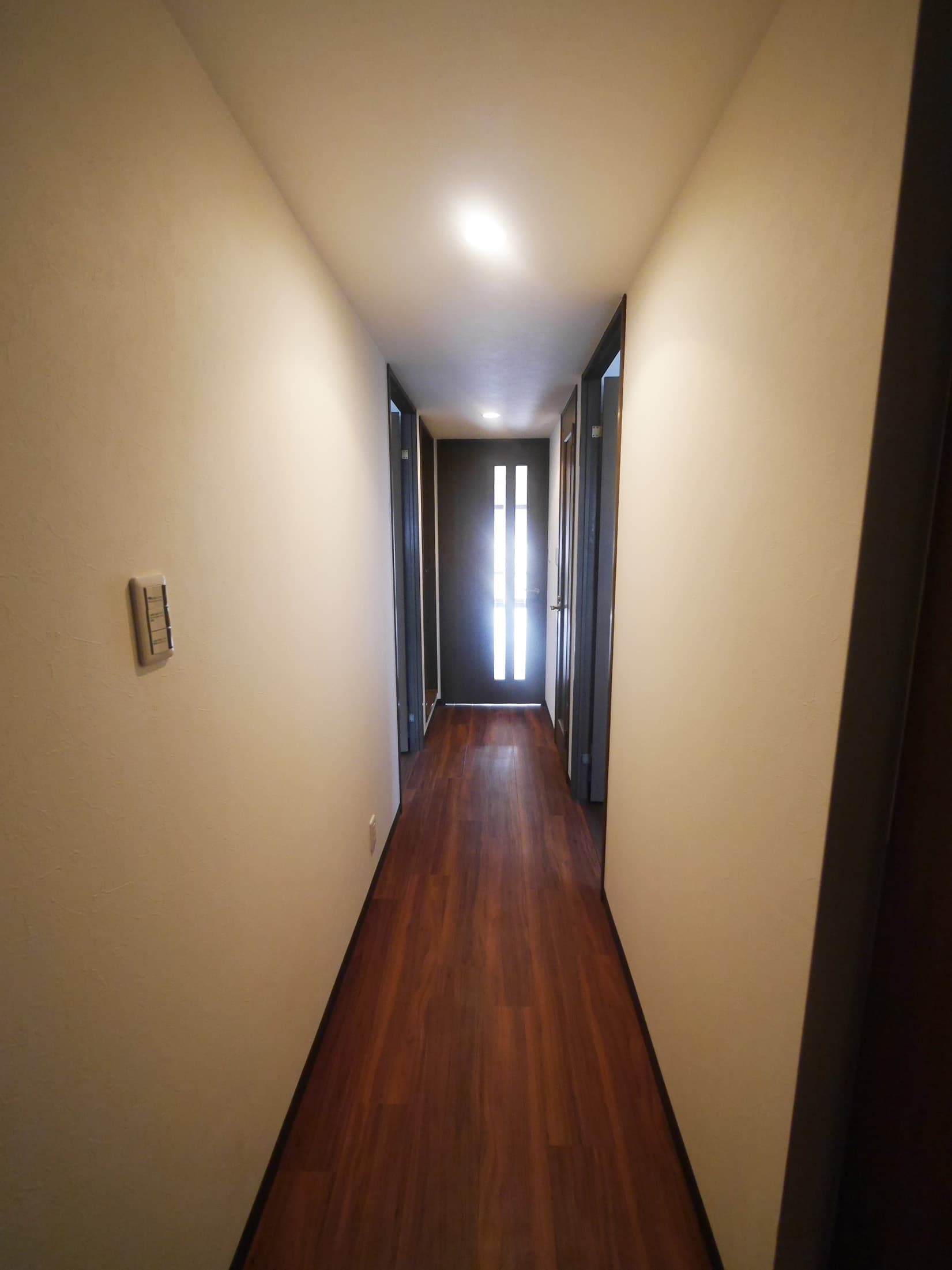 廊下のフローリングもリビング同様フカフカしていないフローリングです。全体的に濃いめの高級感がある木目調に真っ白なクロスとのコントラストが出ていて綺麗に仕上がったと思います。