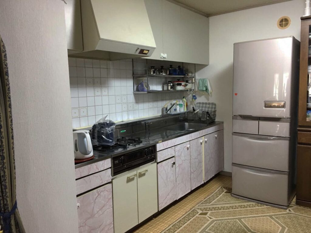 ご予算の事もあり下台と換気扇のみの交換ですが、吊り戸棚はまだ綺麗でしたのでおもて面だけ、下台と同色のダイノックフィルムを貼っています。