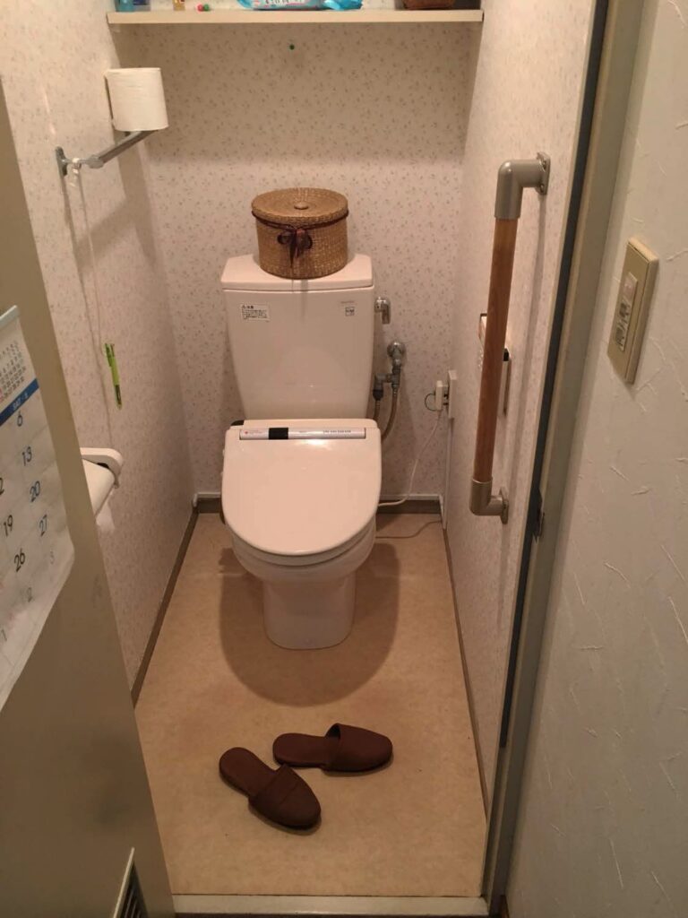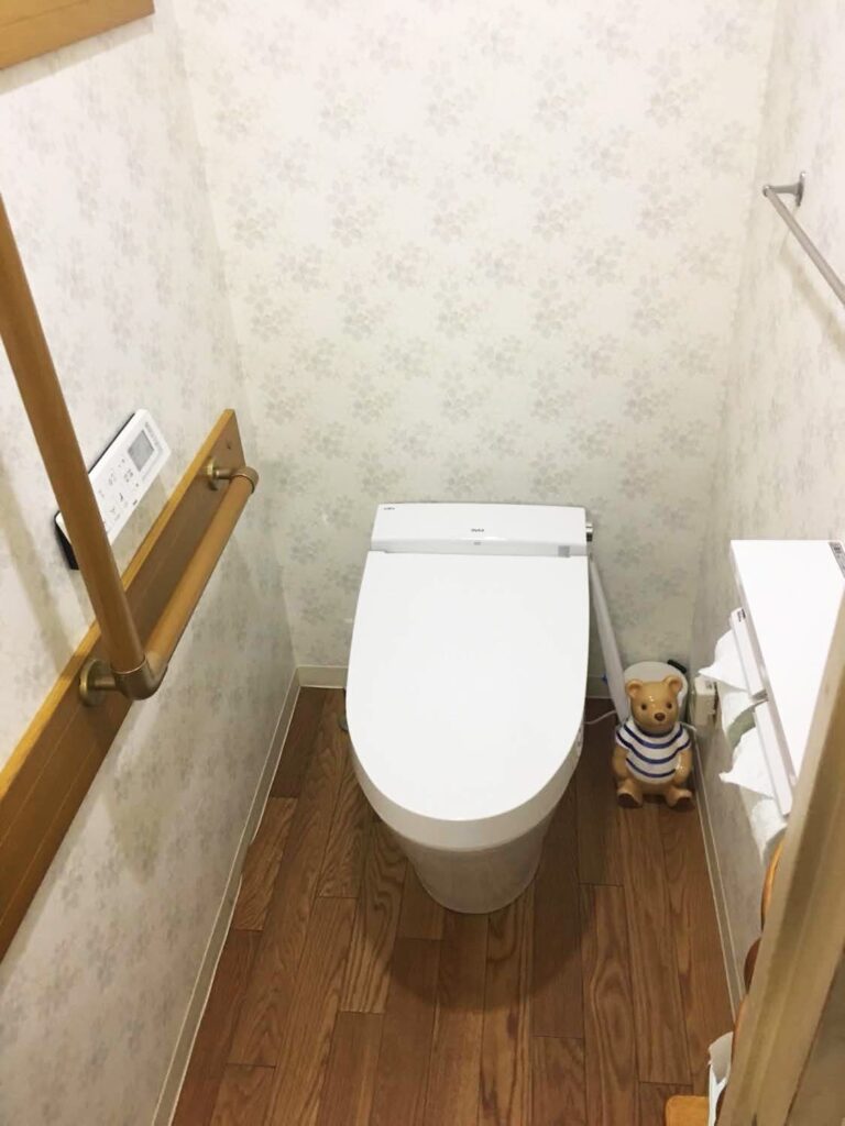 トイレはサティスSのフルオート便座です。ドアを開けたら蓋が自動で開閉いたします。