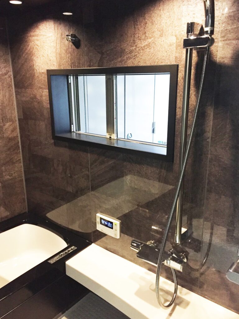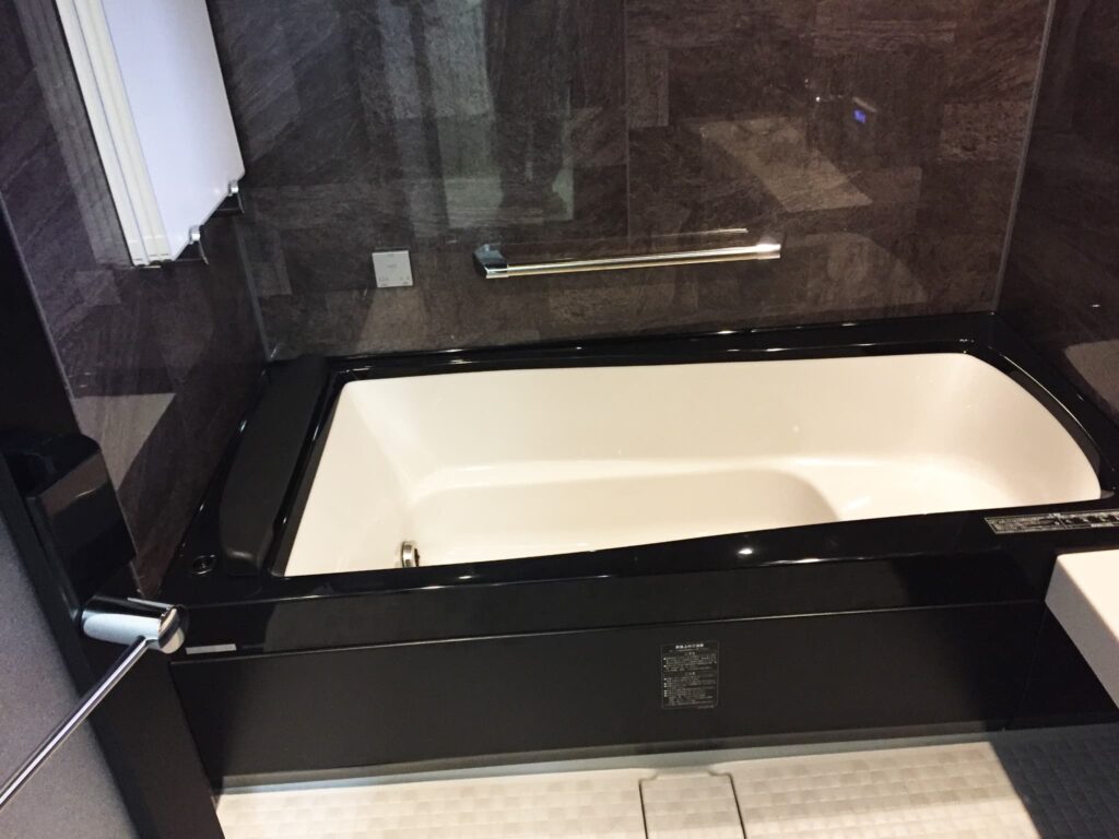 ご主人はショールームにユニットバスをを見学に行かれ、黒基調のスパージュをお気に召され、壁パネルだけでなく浴槽・ドア・天井・換気乾燥暖房機までブラックで統一されました。さすがにユニットバスのドア枠はホワイトにしましたが、浴室内は黒基調の重厚感と高級感溢れるお風呂となっております。