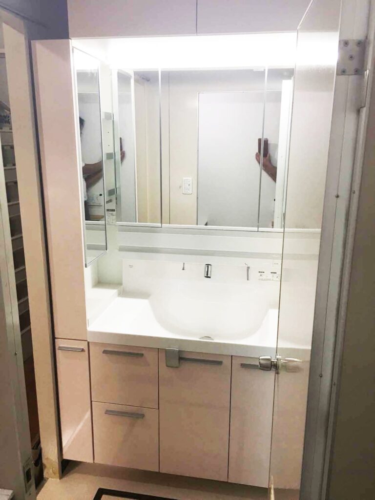 洗面台もLIXILの商品「エルシィ」 です。千葉ガーデンタウンは、ユニットバスの入り口が洗面台にかぶるため奥行きを50cm以内に収める事が重要です。当社では千葉ガーデンタウンの実績が多いので当社のスタッフは誰でも知っています。洗面台が90cm・サイド収納のトールキャビネットが15cm、ピッタリに収まりました。