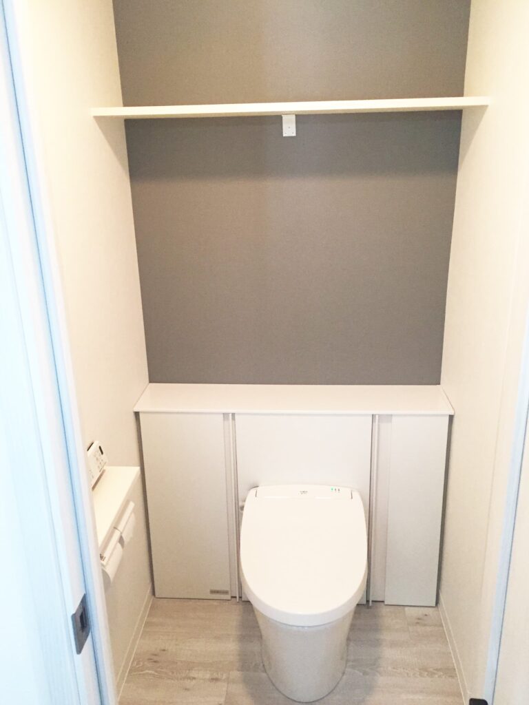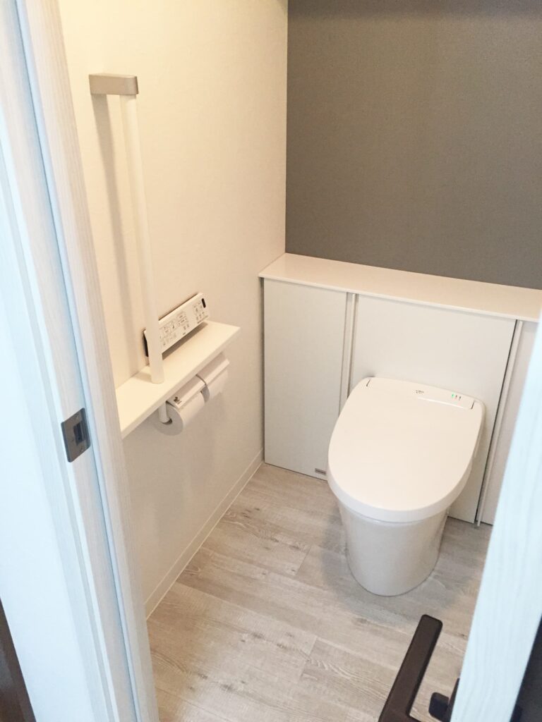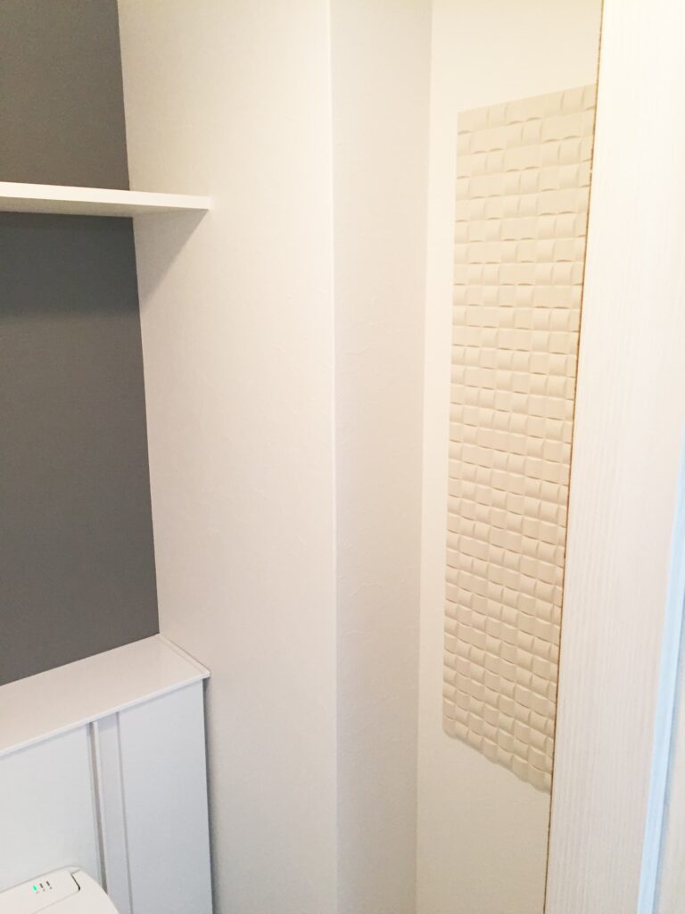 トイレは収納とPSも考えLIXILのリフォレに交換しました。トイレドアは廊下から脱衣所側に変更して間口の大きい中折れ戸を採用しました。トイレ壁と脱衣所の窓廻り(ファインベース)にそれぞれエコカラット(ヴィーレとファインベース)を貼ってグレー色のクロスも合わせてアクセントにしました。