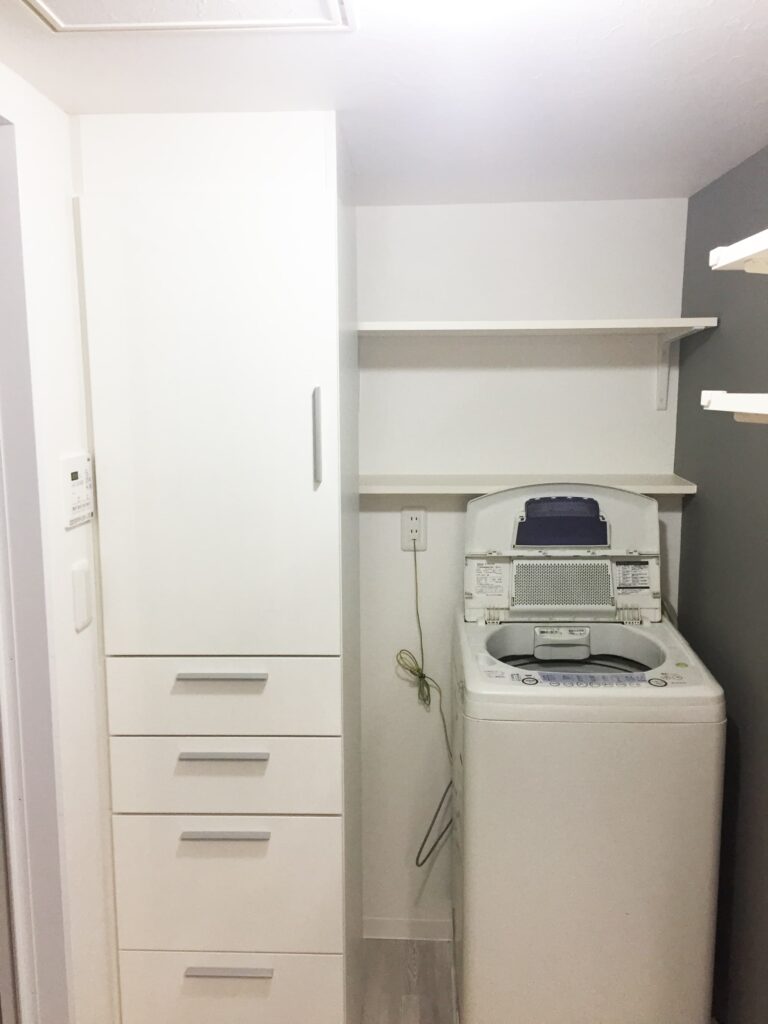 トールキャビネットは洗濯機横のPSサイズに合わせデッドスペースを埋める形で、違和感なく設置できました。
