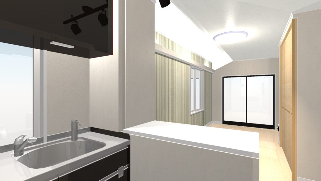 キッチンはLIXILのレノを設置しました。本当は対面型にしたかったのですが、天井にちょうど梁があり、換気扇を付けることができなくなってしまうので、L型にする代わりに対面カウンターを作りました。