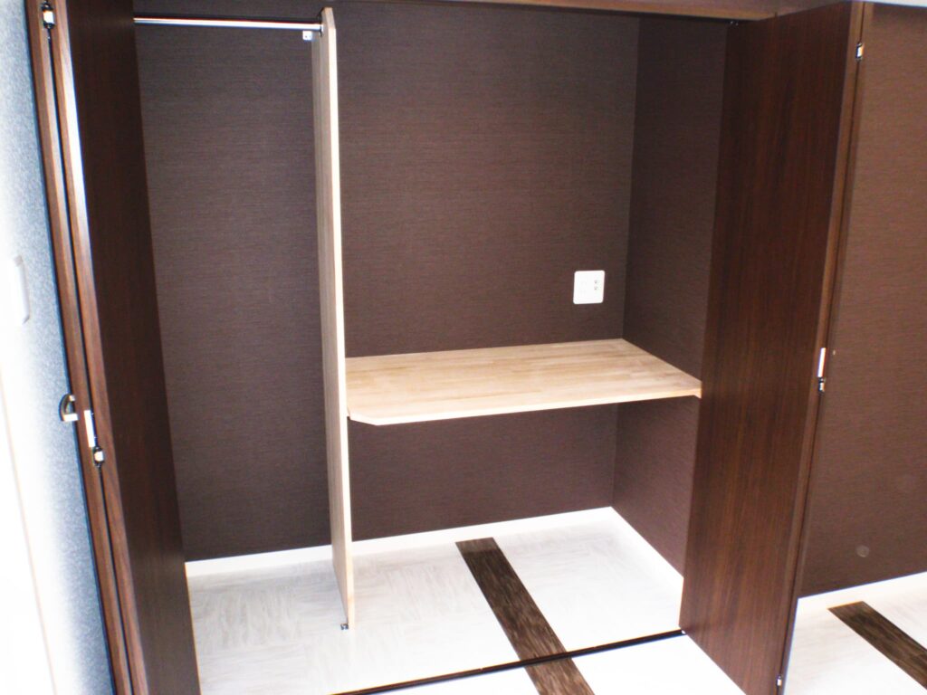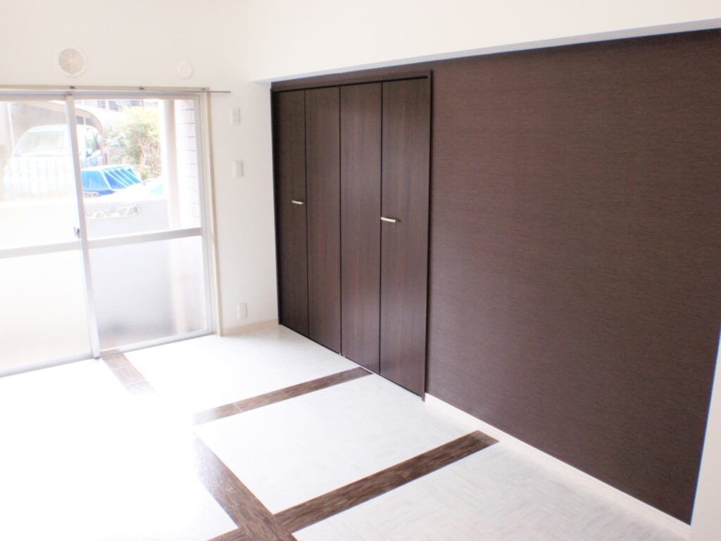 部屋には間接照明をつけて入居希望者が内覧されたときのインパクトを狙いました。押し入れは、クローゼットに変更し床にはフロアタイルを貼り、デザインもフローリングやクッションフロアにはない質感でオシャレに仕上げました。クローゼット内部は、中段しかなかった押し入れでしたが、ハンガーをかけられる部分を作り、パソコンデスクなども入れられるようなスペースを設け、部屋を大きく使える工夫をしました。
