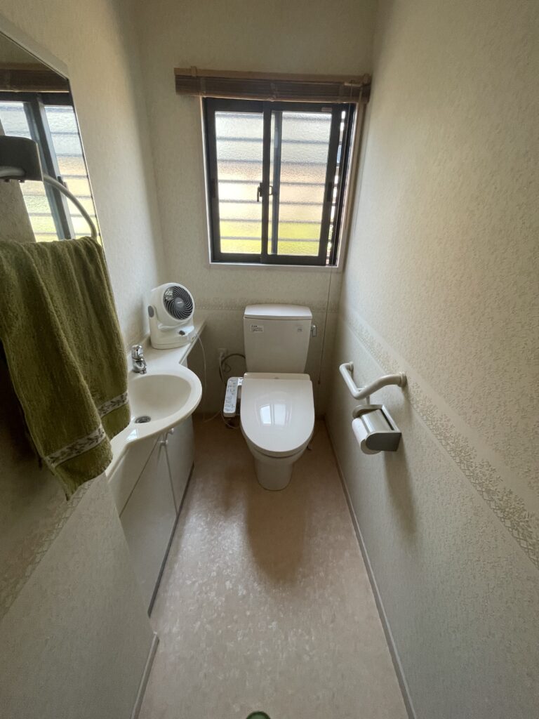 LIXILの「サティスG」を採用しました。また緑のアクセントクロスを貼り、おしゃれで落ち着くトイレ空間になりました。