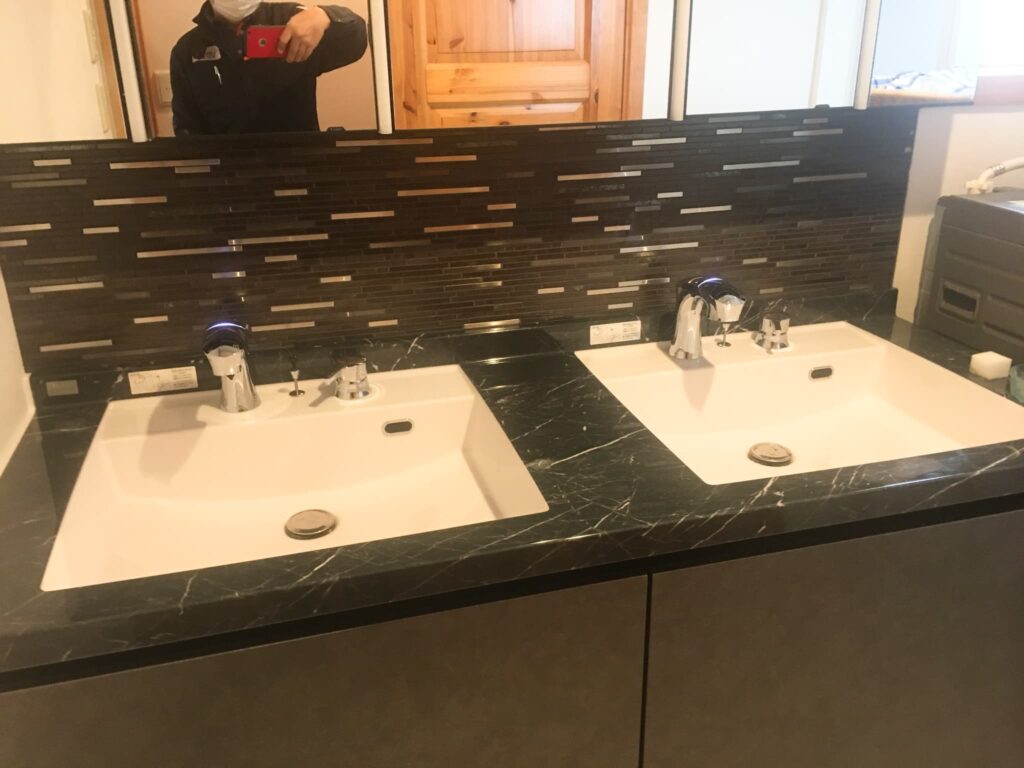ルミシスのボウル一体型2ボウルに、深みのある黒をセレクト。直線的なフォルムとブラックのコントラストが際立ち、空間全体が洗練された印象に仕上がりました。