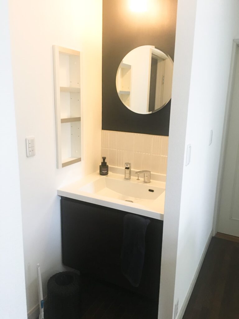 丸いフォルムの鏡が、洗面化粧台にふんわりとした温かみを添える仕上がりになりました。